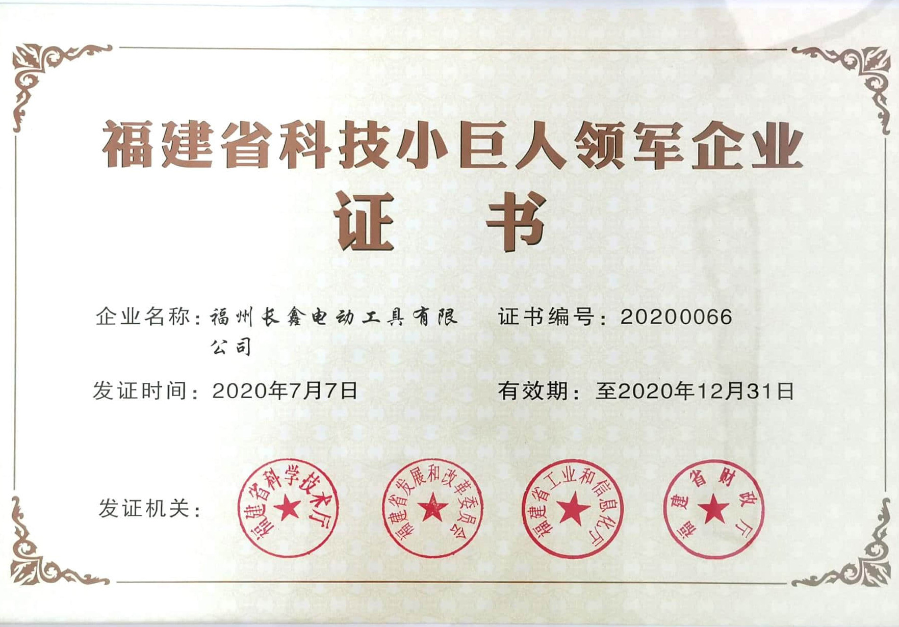 福建省科技小巨人领军企业证书
